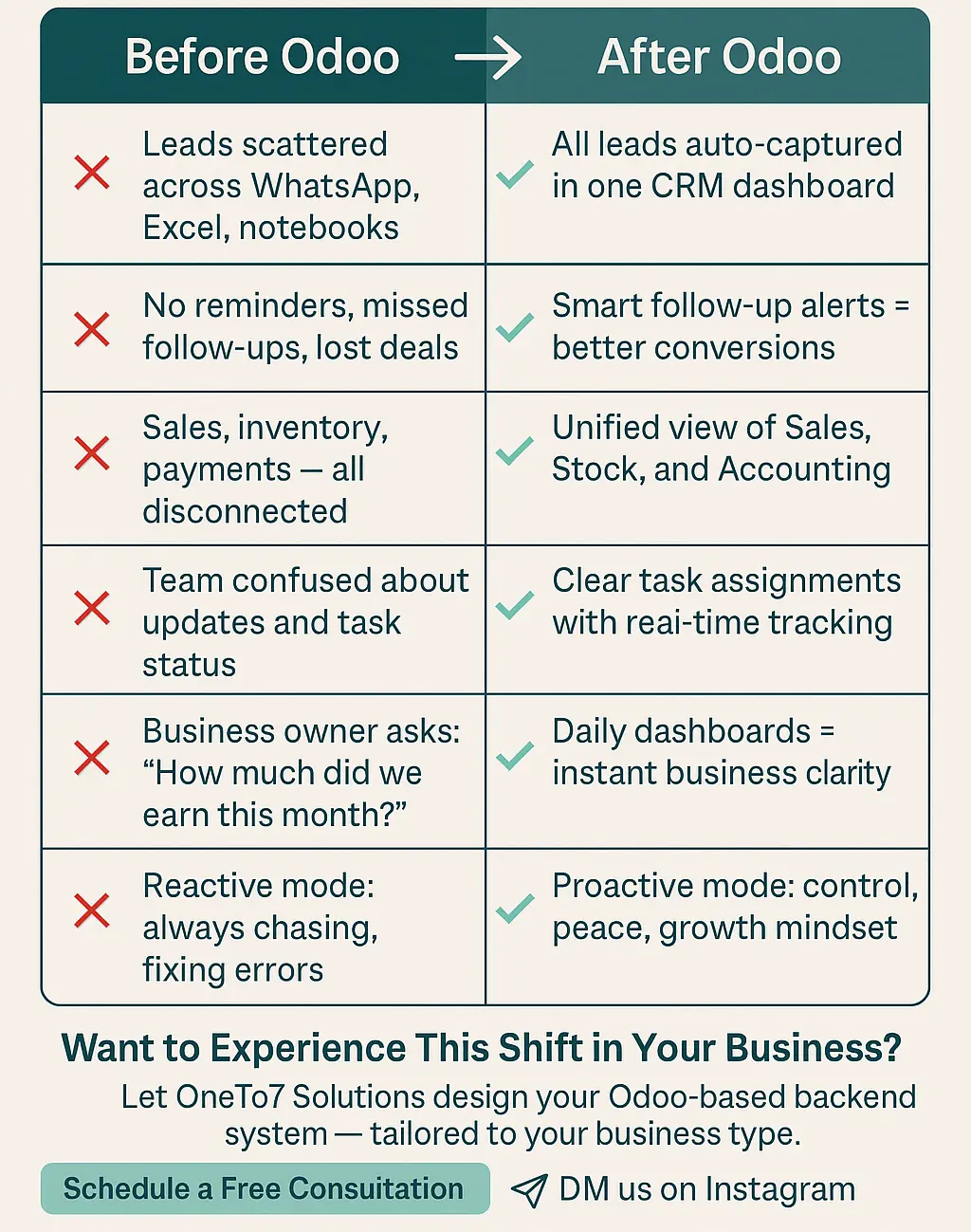 That’s when we implemented a proper system using Odoo ERP — and everything changed.